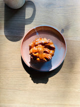 Glaze: Shino, Our modified take on the Japanese Shino glaze, with traditional crazing (small crackles in glaze). Finishes range from bright white with coppery crystals and bronze speckling to orange flashes with swirls of smoky carbon.