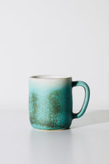 Glaze: Nocturne, White interior with a light blue-green body featuring dark & light green crystals. Each one is a unique expression of the interaction between glaze and kiln.