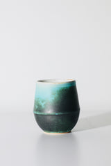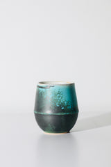 Glaze: Nocturne, White interior with a light blue-green body featuring dark & light green crystals. Each one is a unique expression of the interaction between glaze and kiln.