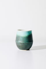 Glaze: Nocturne, White interior with a light blue-green body featuring dark & light green crystals. Each one is a unique expression of the interaction between glaze and kiln.