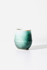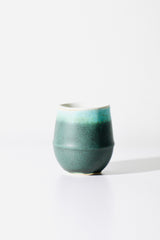 Glaze: Nocturne, White interior with a light blue-green body featuring dark & light green crystals. Each one is a unique expression of the interaction between glaze and kiln.