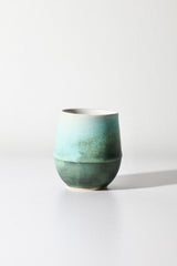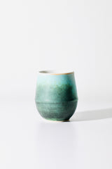 Glaze: Nocturne, White interior with a light blue-green body featuring dark & light green crystals. Each one is a unique expression of the interaction between glaze and kiln.
