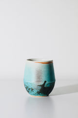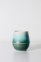 Glaze: Nocturne, White interior with a light blue-green body featuring dark & light green crystals. Each one is a unique expression of the interaction between glaze and kiln.