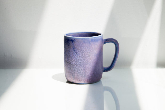 Glaze: Aubade, a luminous satin-finish purple glaze, featuring lilac highlights and rich speckled undertones of Prussian blue.